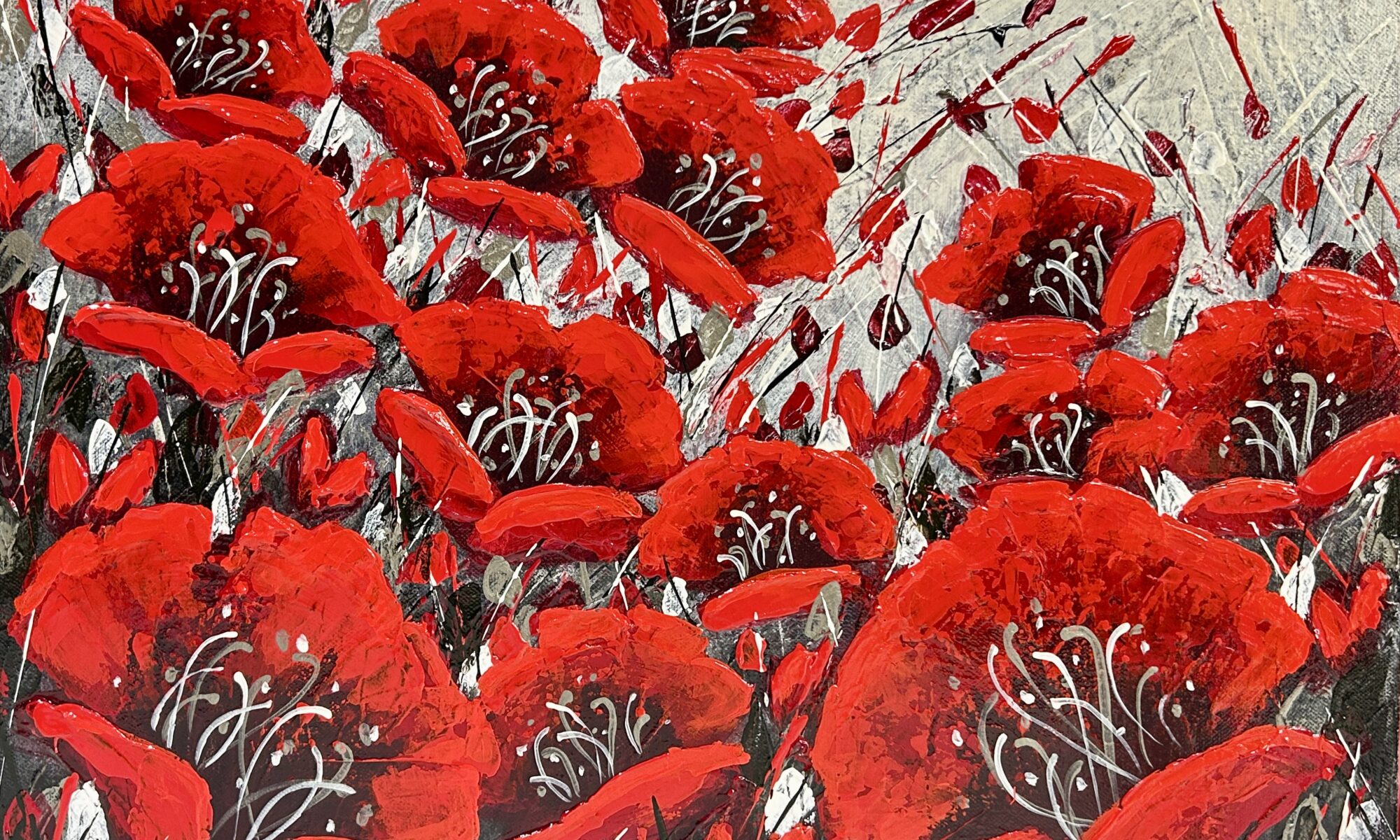 This particular poppy painting is heavier – more layers – more texture – more memories. The bright deep reds come forward through the complexed layered background- like a memory – a promise.