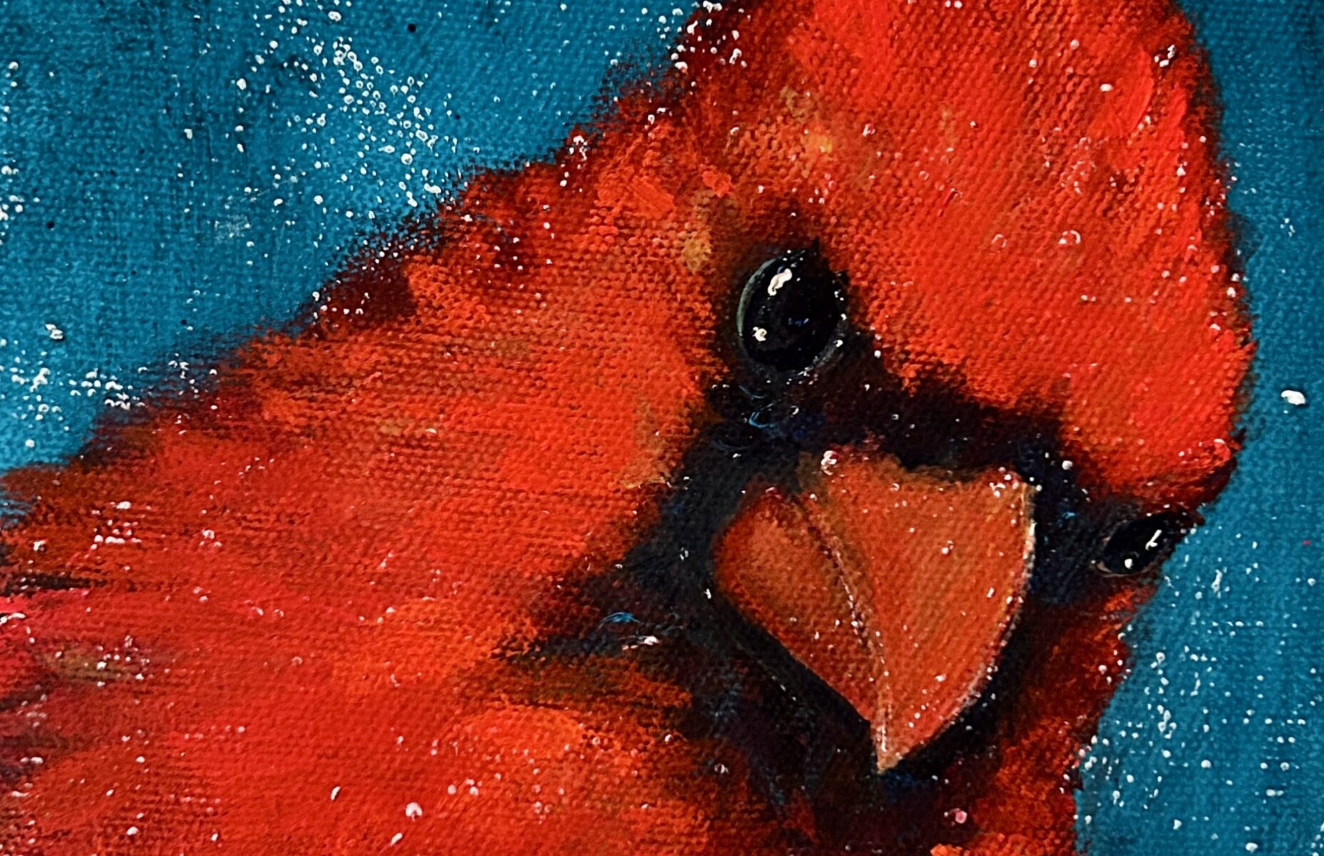 fun and vibrant winter cardinal on a bright teal background. Acrylic on stretched gallery canvas and finished with a gloss varnish